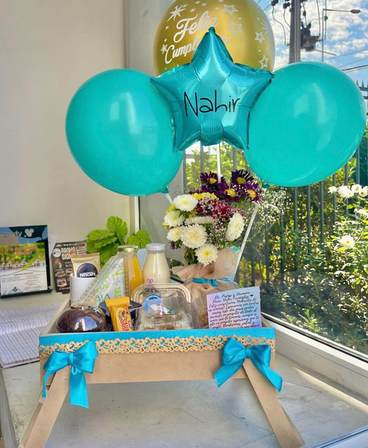 Desayuno tradicional en bandeja de cama y decoración con helio